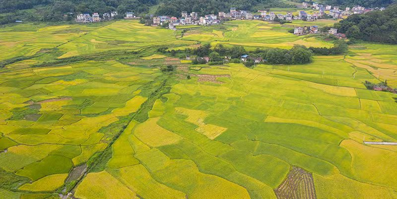 9月,广西桂林,全州县才湾镇七星村中稻一片金黄如壮美绚丽的壮锦。时下,即将迎来农民丰收节,享有“桂北粮仓”美誉的广西桂林市全州县各乡镇30余万亩中、晚稻陆续成熟,广袤的稻田犹如金色地毯铺在山村和田野之间,如一幅幅秋日丰收画卷,景色美不胜收,游客纷纷前来打卡留影。