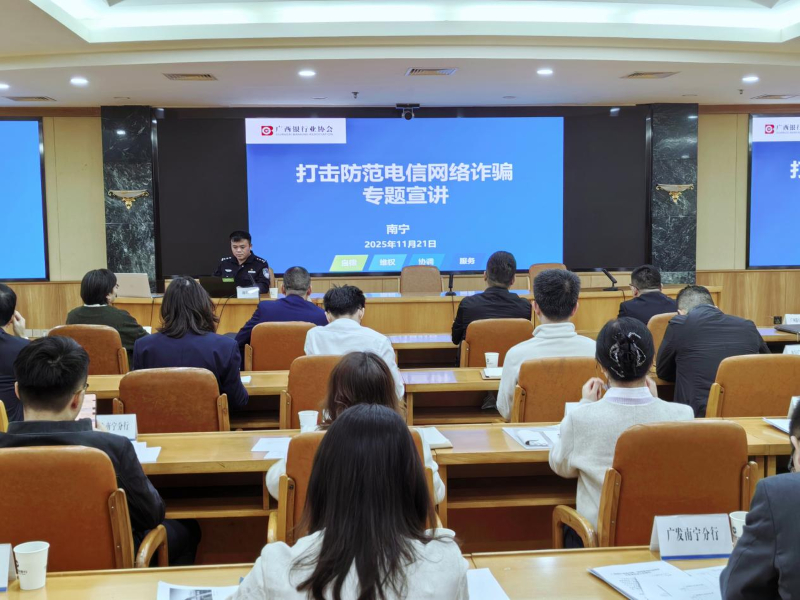 2025年11月21日,广西银行业协会在南宁举办打击防范电信网络诈骗专题交流会。协会专职副会长晏伟出席会议,会员单位消保部门、协会纠纷调解中心、法律维权部相关负责人参会。
