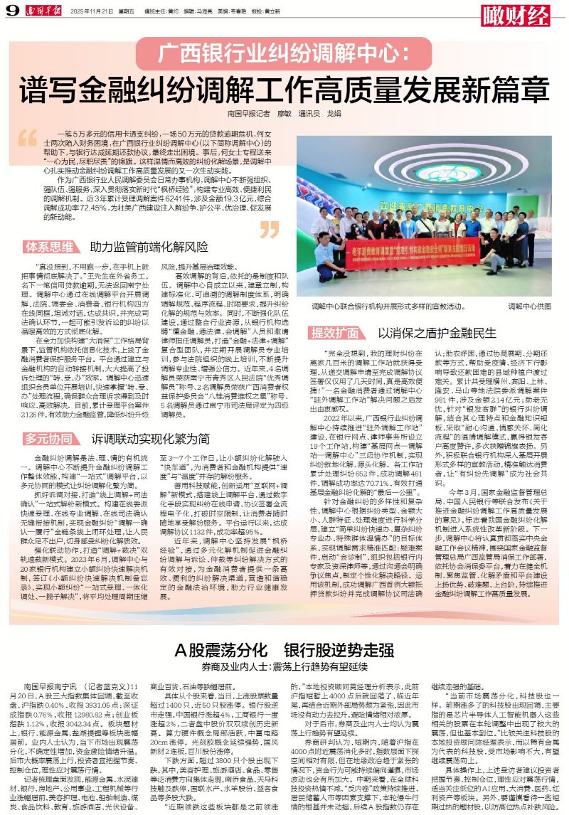今年3月,国家金融监督管理总局、中国人民银行等联合发布《关于推进金融纠纷调解工作高质量发展的意见》,标志着我国金融纠纷化解机制进入系统性改革新阶段。下一步,调解中心将认真贯彻落实中央金融工作会议精神,围绕国家金融监督管理总局广西监管局消保工作部署,依托协会消保委平台,着力在健全机制、聚焦监管、化解矛盾和平台建设上扬优势、破难题、上台阶,持续推进金融纠纷调解工作高质量发展。(来源:南国早报客户端)